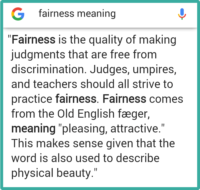 Video shows what fairness means. Equity definition, the quality of being fair or impartial; The meaning of fair is marked by impartiality and honesty : The property of being fair or. Fairnessnoun · the quality of being good looking and attractive. Beauteousness, comeliness, loveliness · conformity with rules or standards. Meaning of fairness in tamil. Fairness translation and definition in tamil, related phrase, antonyms, synonyms, examples for fairness. How to pronounce, definition audio dictionary. Use translate.com to cover it all. Need the translation of fairness in tamil but even don't know the meaning? Here's a list of translations. Definition of fairness in the definitions.net dictionary.