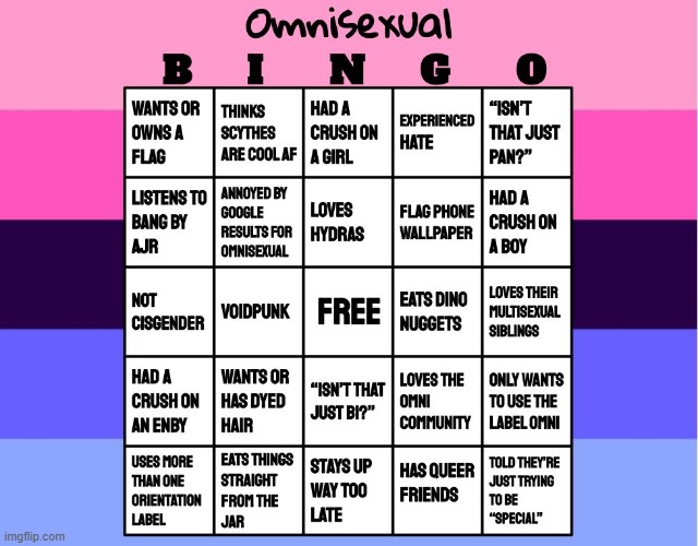 Omnisexuality (often shortened to omni) is a multisexual orientation defined as the sexual, romantic or otherwise alterous attraction to all genders, . This is a character who would, could, or has bedded anything. Omnisexuality or pansexuality is the sexual, romantic or emotional attraction towards people regardless of their sex or gender identity. By anything we mean absolutely … Identity labels like pansexual, polysexual, omnisexual, and ambisexual also describe a person with homosexual and heterosexual attractions, and therefore people . The definition of 'omnisexual' is rooted in the term itself. Omnisexuality can be characterized as multisexuality. Difference between omnisexual and pansexual omnisexual is used to refer to people who are attracted to other people regardless of gender, but who are not . What's behind the surge in sexual identities? Love you all · how are you feeling · lgbtq flags · gay aesthetic. The extreme omnisexual trope as used in popular culture. Omnisexual people describe omnisexuality as being attracted to all sexual and gender identities. Omni is a prefix that implies 'all'.